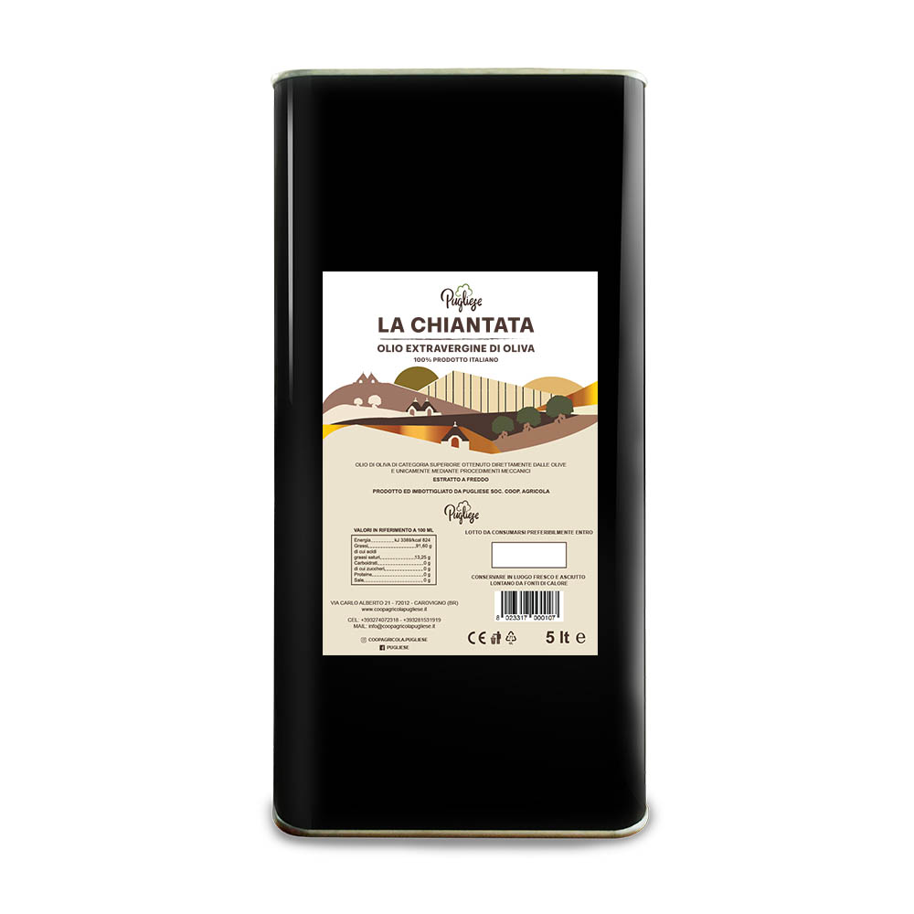 Olio Extravergine di Oliva in lattina da 5 Litri prodotto dalla Cooperativa “Pugliese” di Carovigno, 100% Italiano, campagna olearia 2024/2025, estratto a freddo di categoria equilibrato.